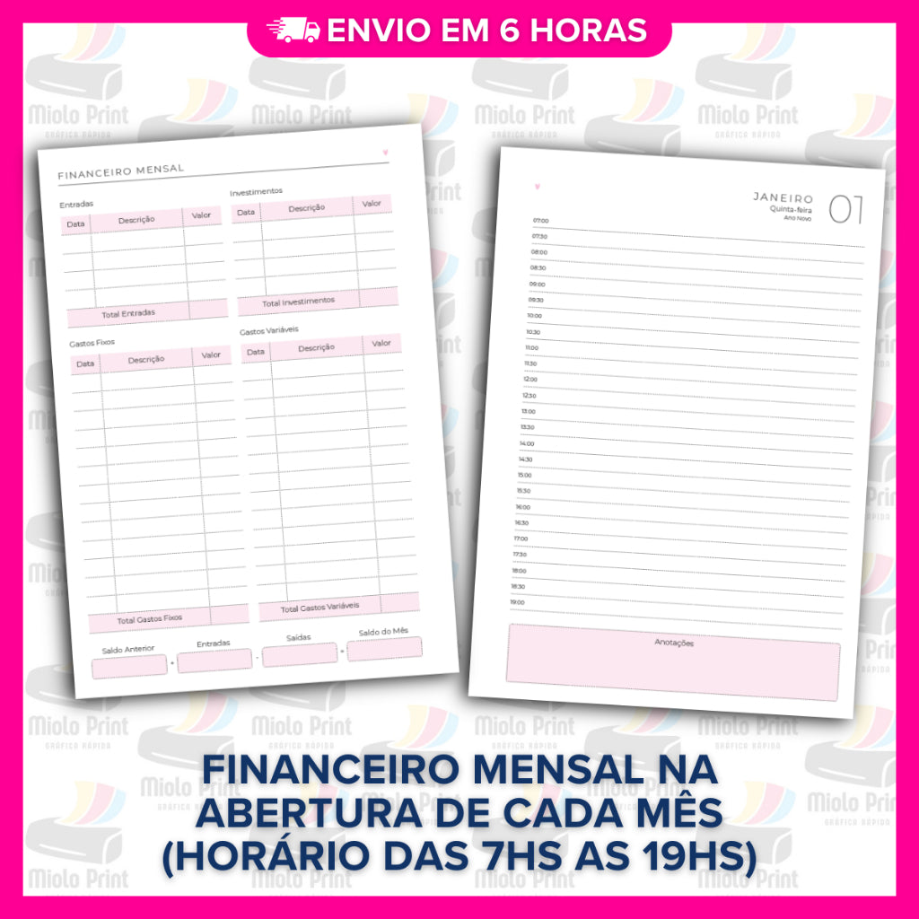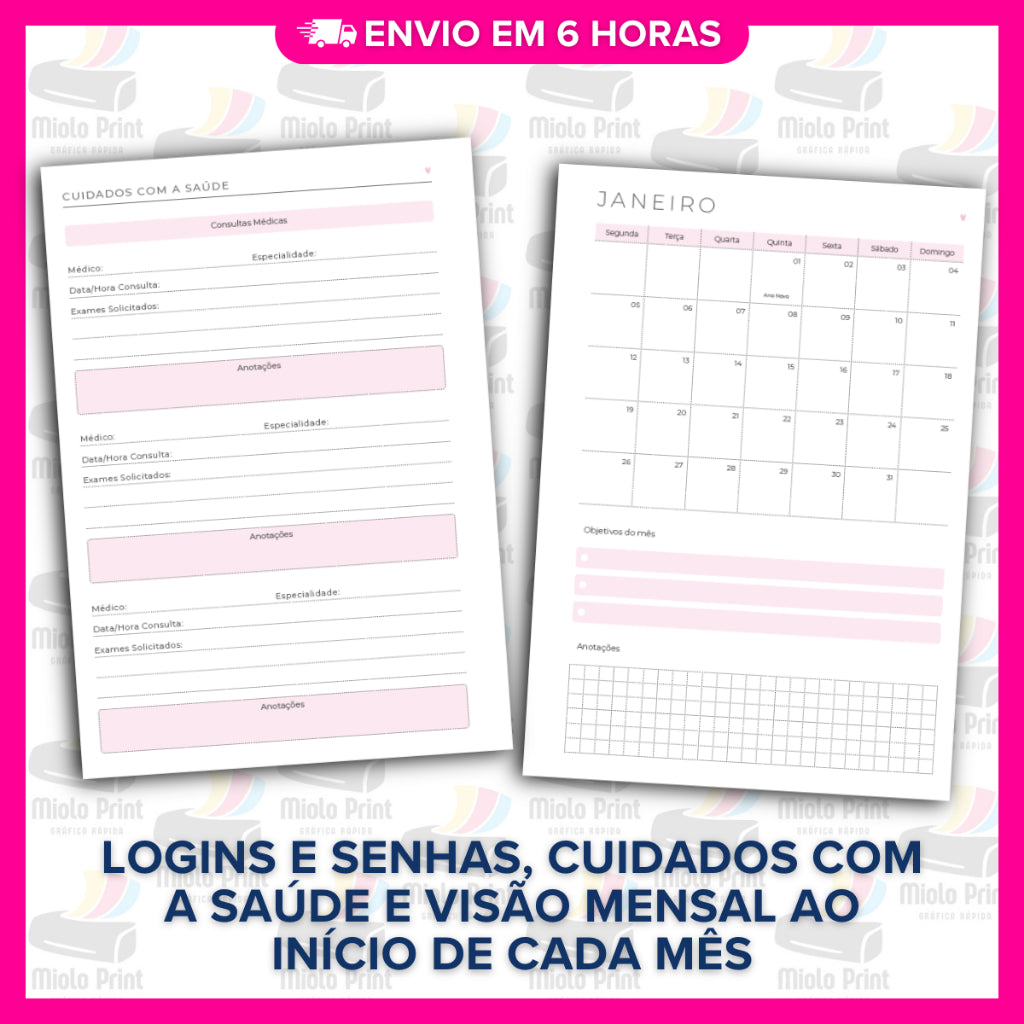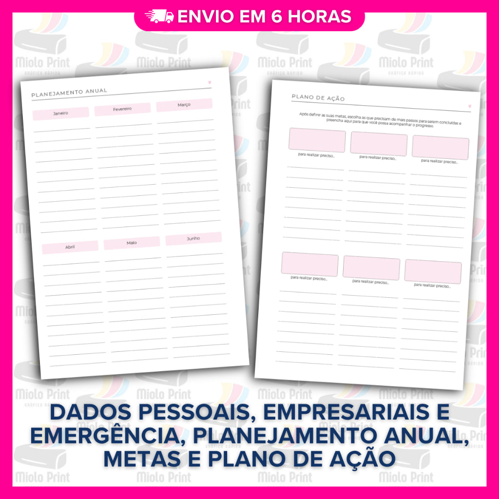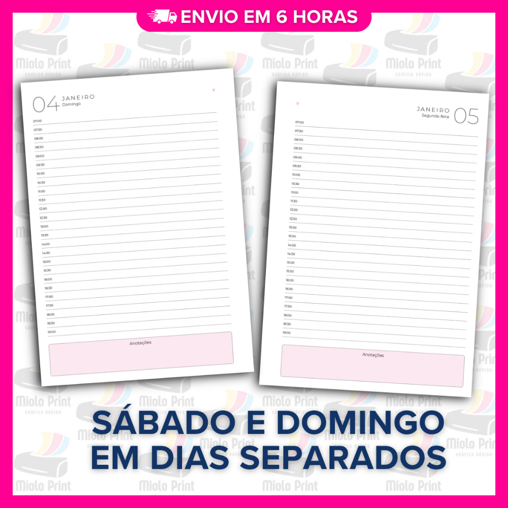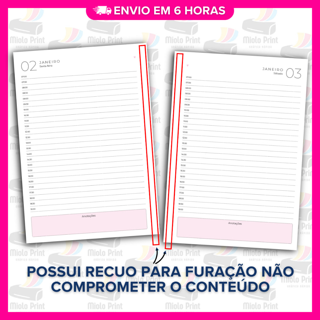 Ideal para produção de agendas personalizadas! Miolo impresso em papel 90g (FOLHAS SOLTAS), com alta qualidade e resistência, perfeito para quem busca agilidade, economia de tempo e acabamento profissional. Evita falhas de impressão, tinta borrada e retrabalho. Vai prontinho para uso, facilitando a rotina de quem trabalha com encadernação artesanal.