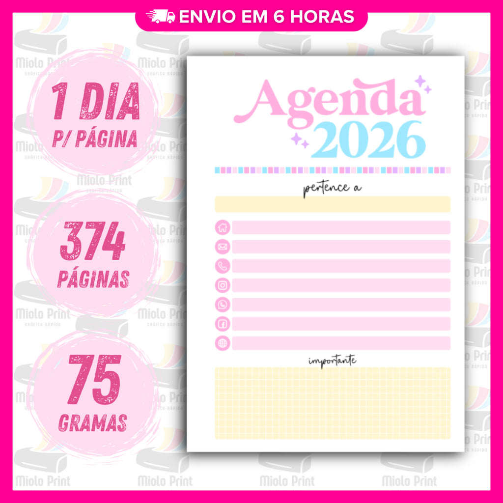 Miolo Impresso Agenda Candy 1DPP 2026 | Tamanho A5 | Papel 75gr