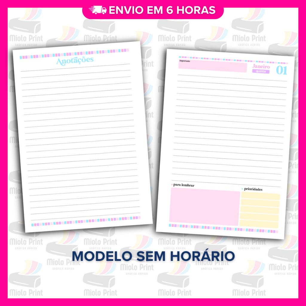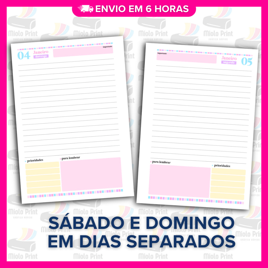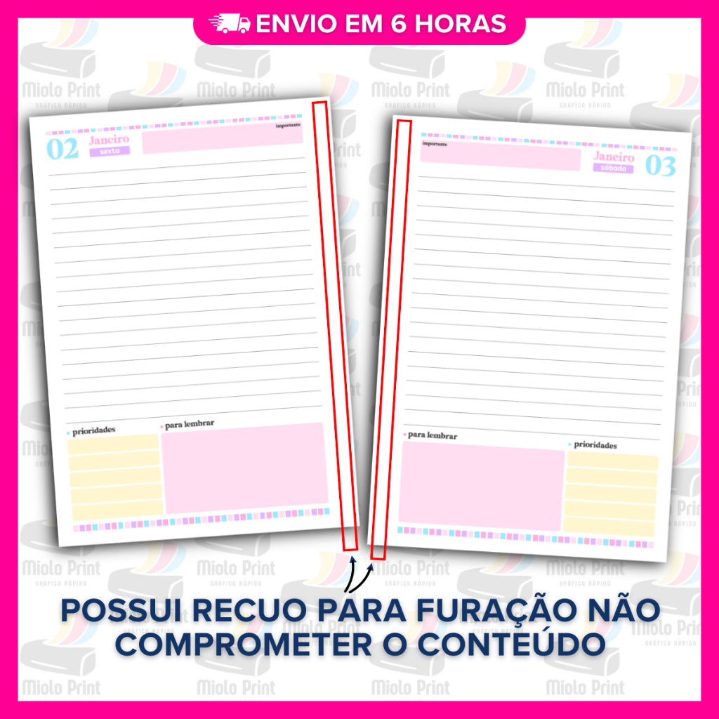 Ideal para produção de agendas personalizadas! Miolo impresso em papel 75g (FOLHAS SOLTAS), com alta qualidade e resistência, perfeito para quem busca agilidade, economia de tempo e acabamento profissional. Evita falhas de impressão, tinta borrada e retrabalho. Vai prontinho para uso, facilitando a rotina de quem trabalha com encadernação artesanal.
