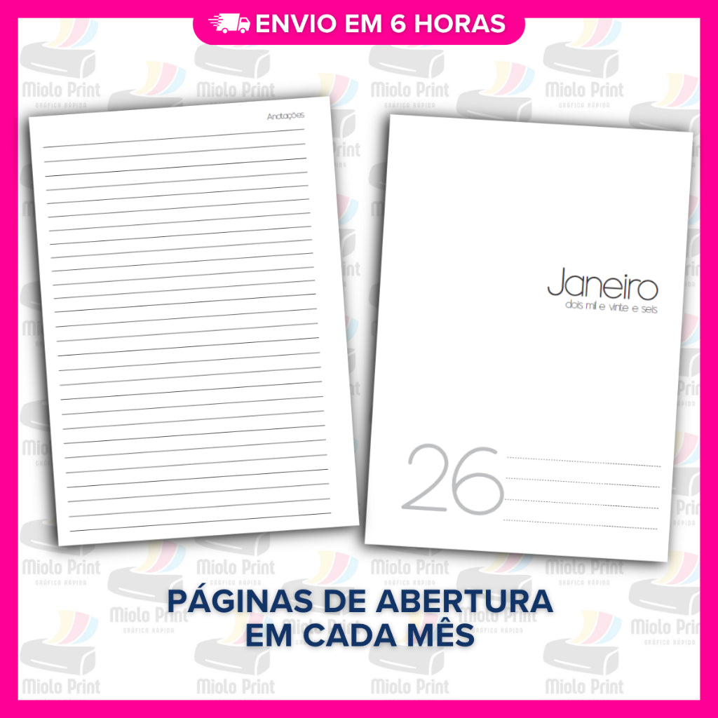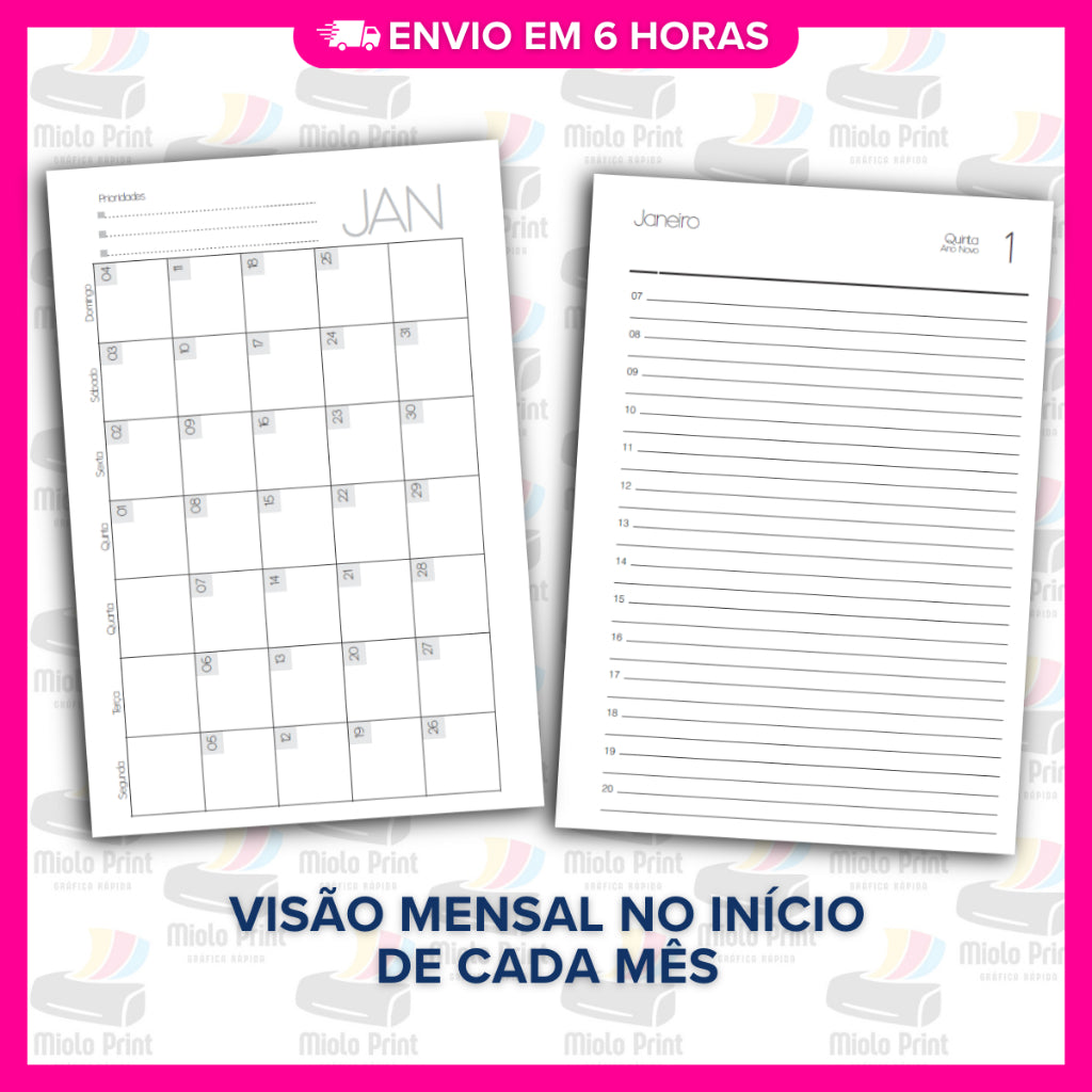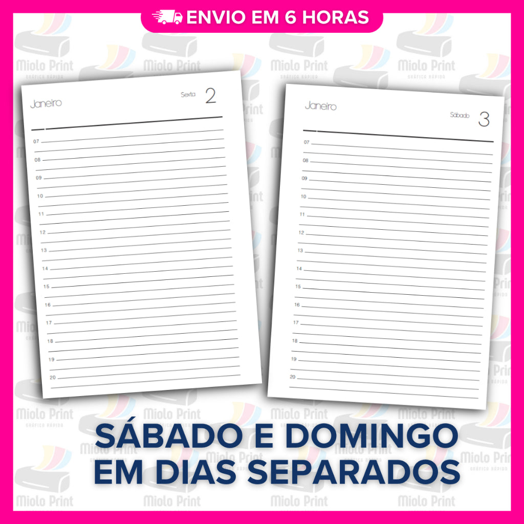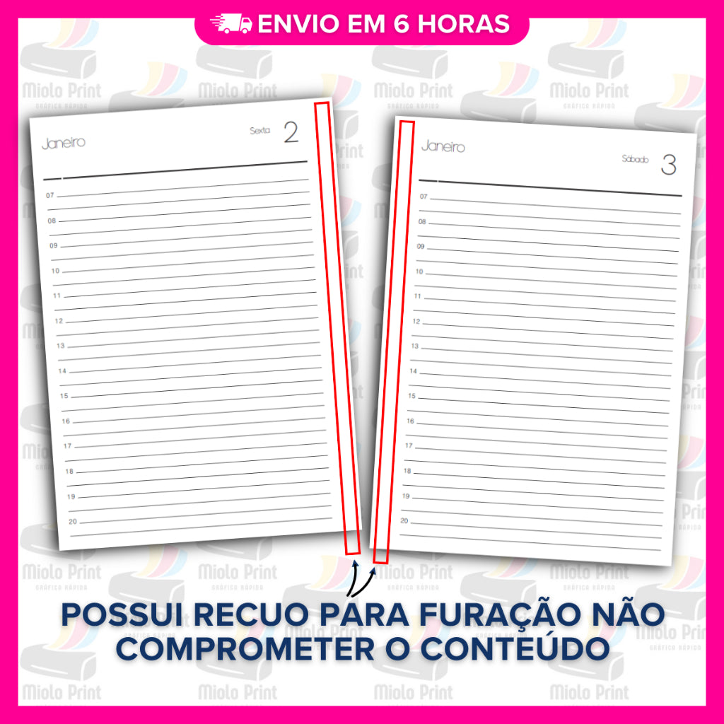 Ideal para produção de agendas personalizadas! Miolo impresso em papel 90g (FOLHAS SOLTAS), com alta qualidade e resistência, perfeito para quem busca agilidade, economia de tempo e acabamento profissional. Evita falhas de impressão, tinta borrada e retrabalho. Vai prontinho para uso, facilitando a rotina de quem trabalha com encadernação artesanal.