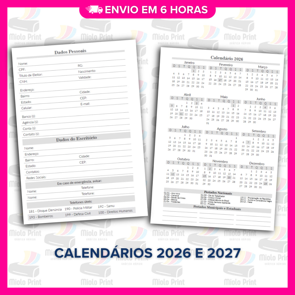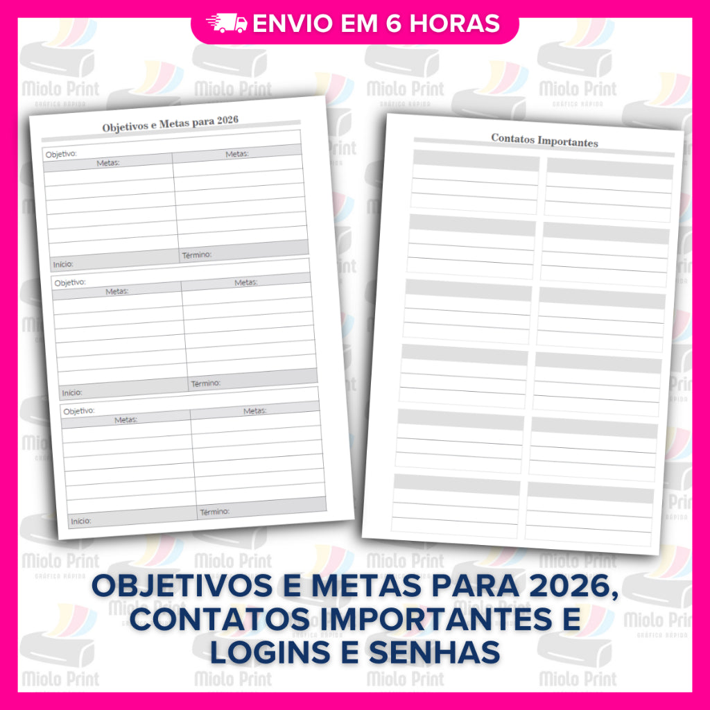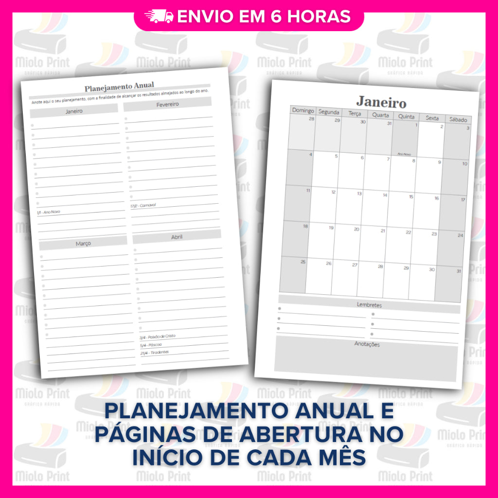 Ideal para produção de agendas personalizadas! Miolo impresso em papel 75g (FOLHAS SOLTAS), com alta qualidade e resistência, perfeito para quem busca agilidade, economia de tempo e acabamento profissional. Evita falhas de impressão, tinta borrada e retrabalho. Vai prontinho para uso, facilitando a rotina de quem trabalha com encadernação artesanal.