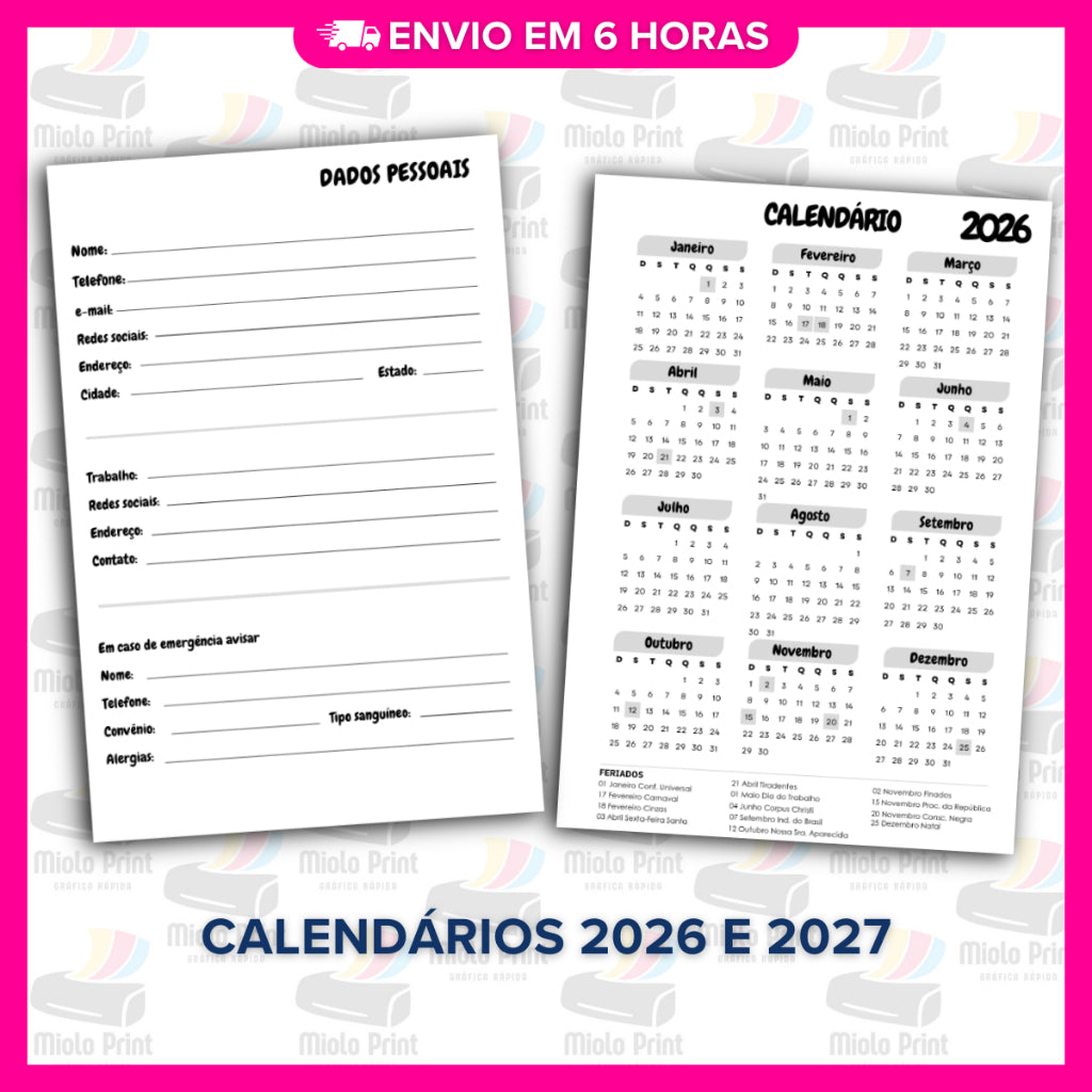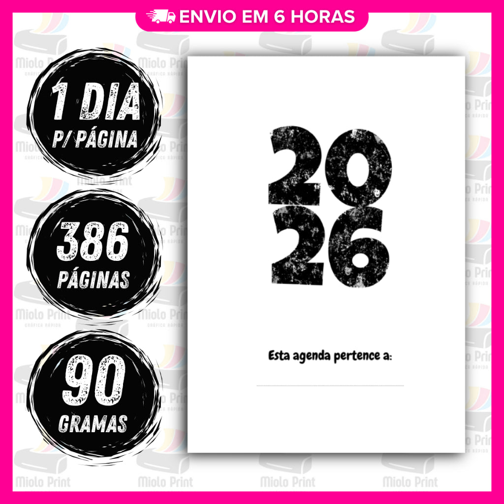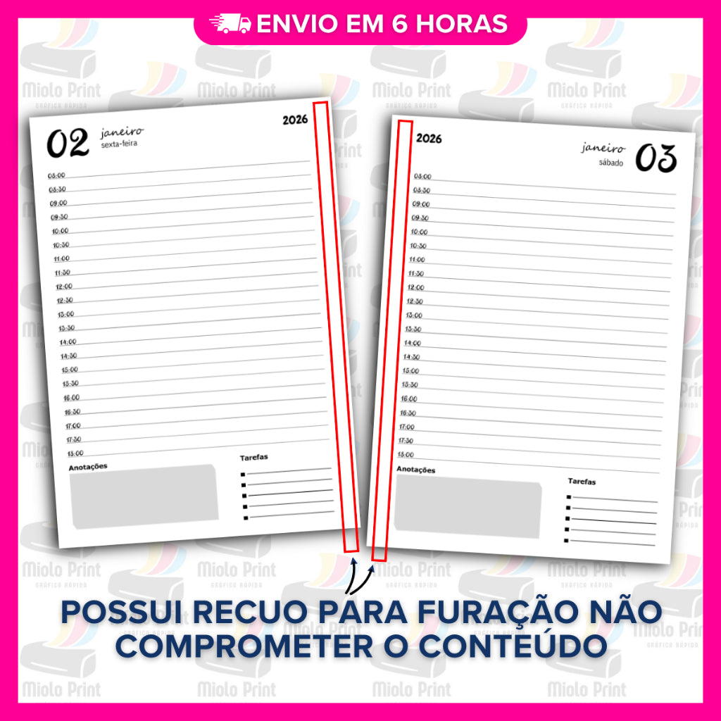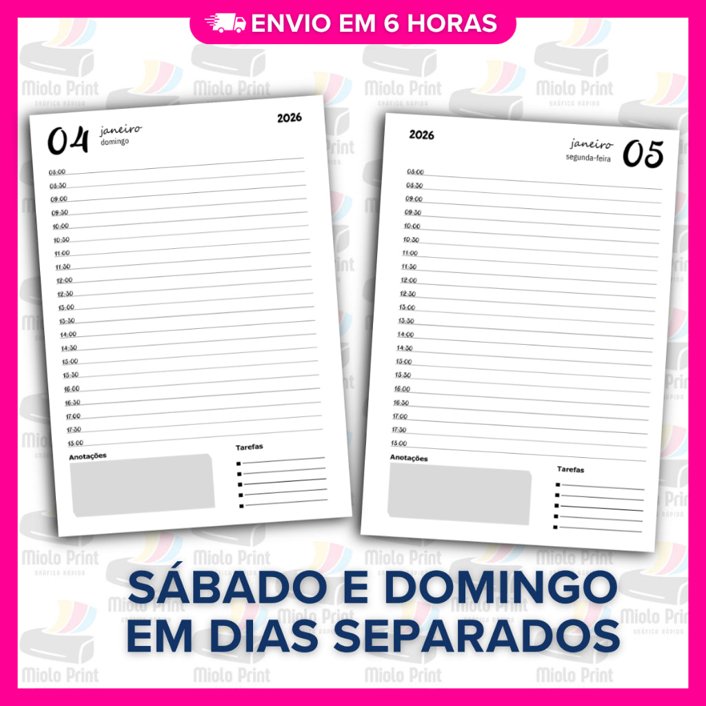 Ideal para produção de agendas personalizadas! Miolo impresso em papel 90g (FOLHAS SOLTAS), com alta qualidade e resistência, perfeito para quem busca agilidade, economia de tempo e acabamento profissional. Evita falhas de impressão, tinta borrada e retrabalho. Vai prontinho para uso, facilitando a rotina de quem trabalha com encadernação artesanal.